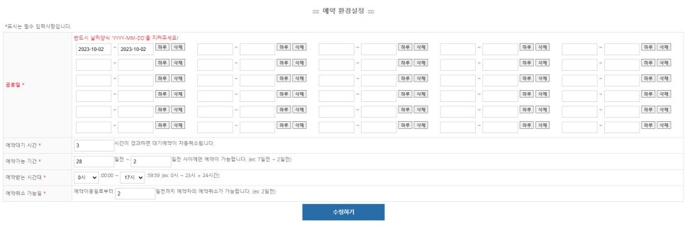 ❍ 시설예약 설정 – 공휴일, 대기시간, 가능시간, 시간대, 예약가능일